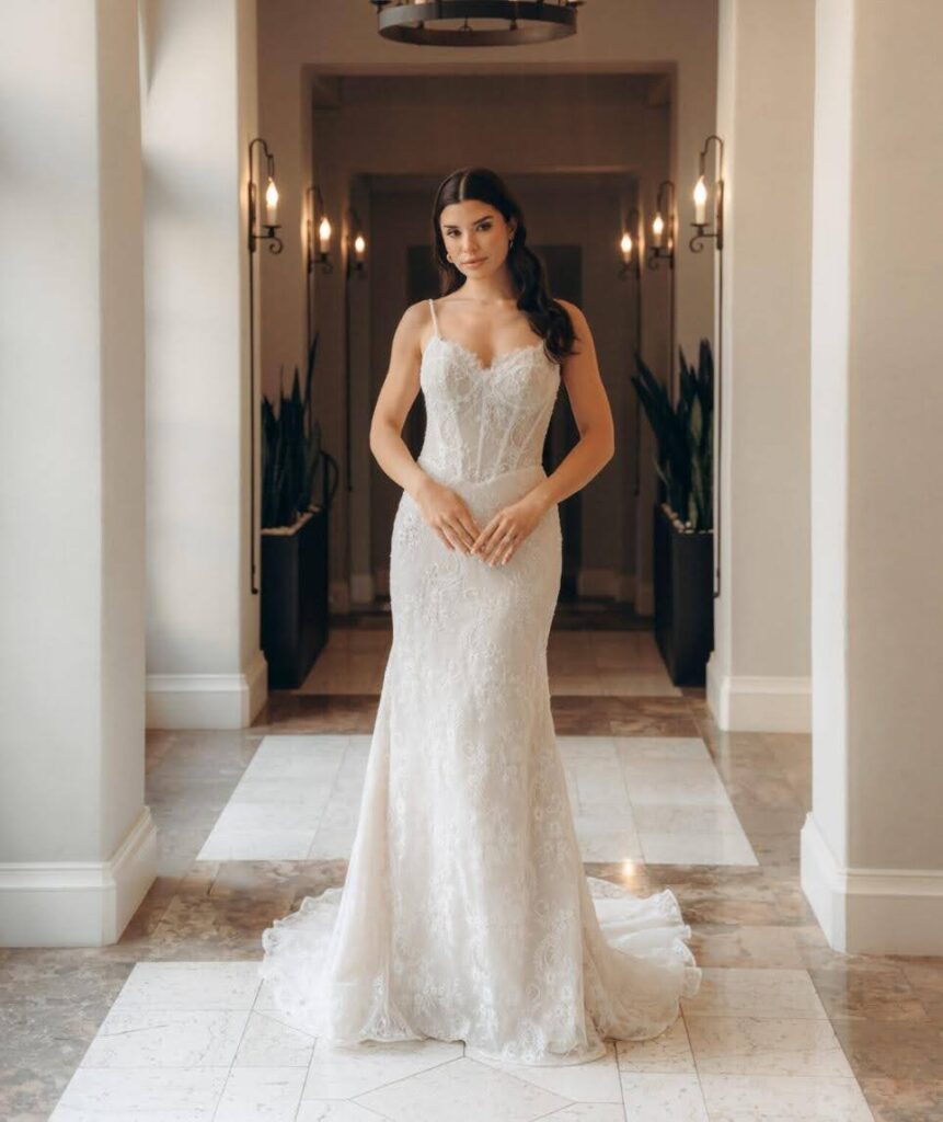 • Silhouette – Ballgowns feel dramatic for formal settings, while fit-and-flare or sheath gowns work beautifully for more intimate venues.