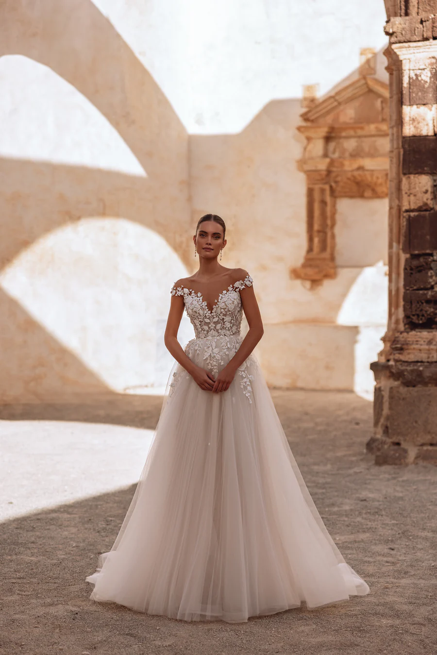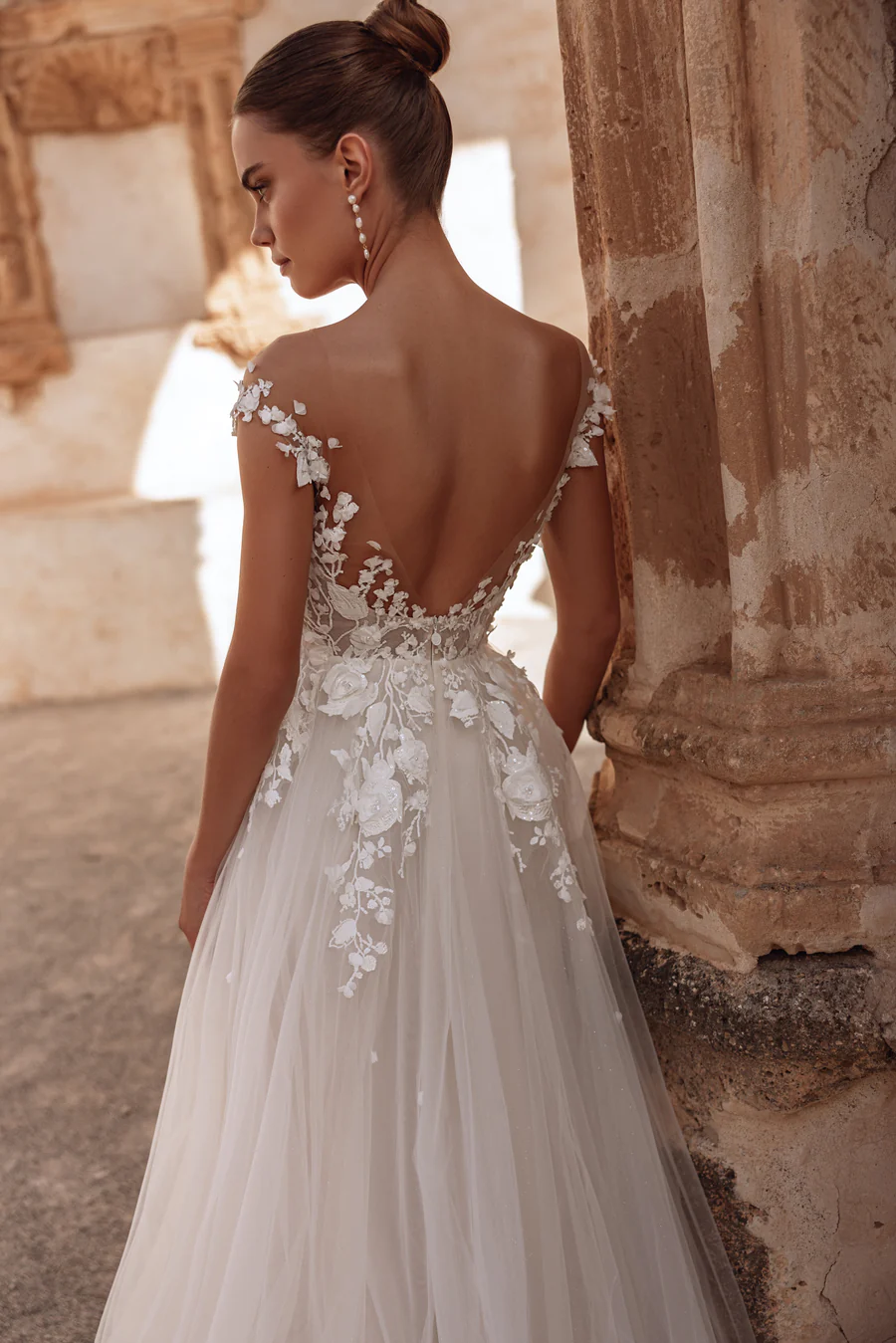 Andrea is a gown that blends delicacy with confidence, offering a look that feels both romantic and refined. The illusion neckline decorated with floral appliqués creates the effect of lace gently resting on the skin, while the fitted bodice highlights the waist with subtle structure. The low V-back adds a modern touch, balancing softness with allure. Flowing layers of tulle form a light, graceful skirt that moves beautifully with every step, creating a silhouette that feels effortlessly feminine.