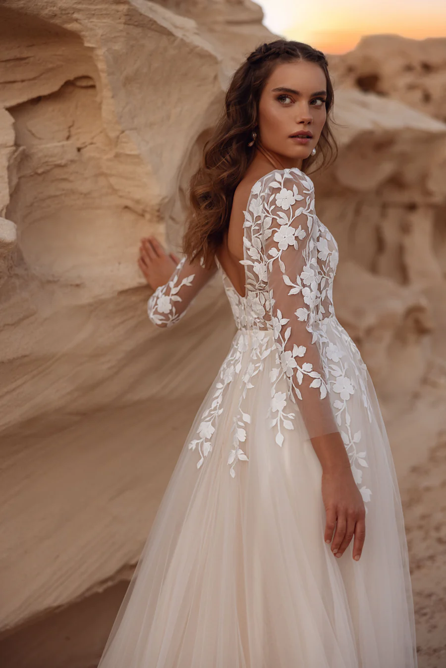 Armori is a gown designed for brides who want a look that feels romantic, refined, and effortlessly feminine. The plunging V neckline shapes the figure beautifully, while the fitted bodice with floral lace appliqués draws the eye with its delicate detailing. Sheer long sleeves offer a sense of light coverage, finished with matching lace that blends seamlessly with the design.