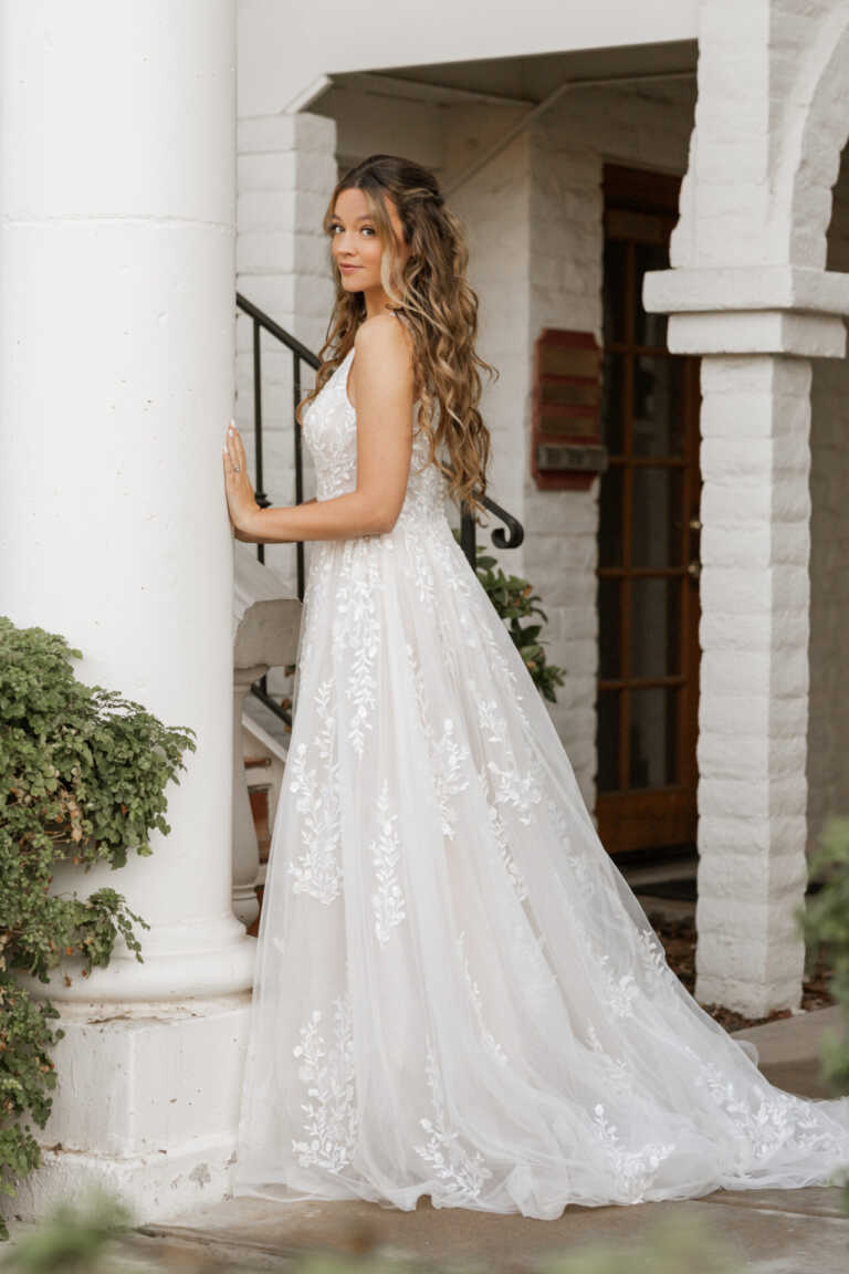 Sparkling down the aisle, Eva’s dreamy leafy floral lace and organza over optional glitter tulle captures the ethereal essence of this romantic A-line wedding gown. Lace-embellished shoulder straps frame a plunging V-neckline topping the sheer, glittering bodice. Leafy tendrils and sparkling floral accents scatter from the bodice to the frothy tulle A-line skirt, evoking a wistful, dreamlike effect. With each step, the glittering tulle catches the light, shimmering for the modern romantic’s walk down the aisle.
