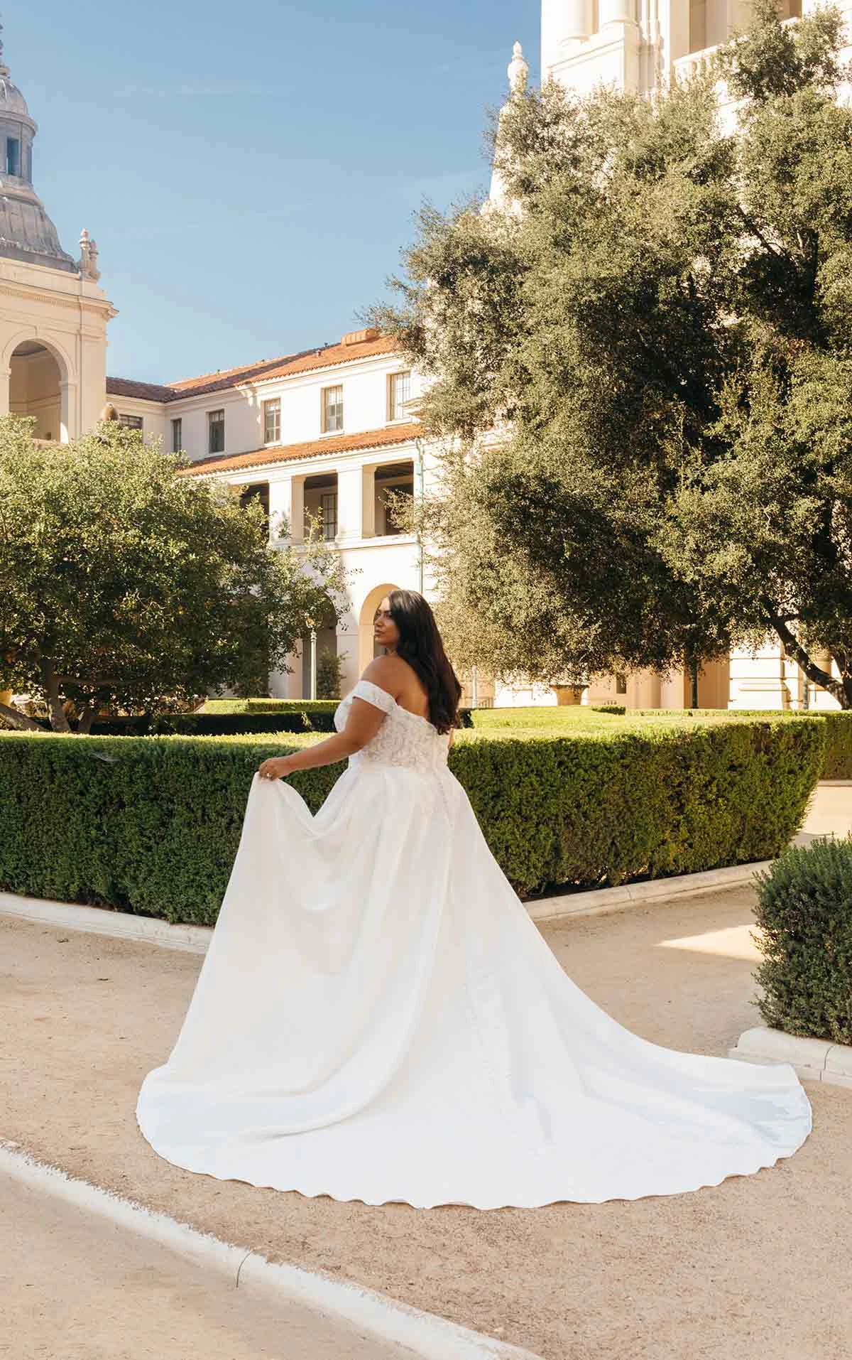 The beauty is in each opulent detail that sparkles from the intricate beading and sequin lace of this romantic ballgown wedding dress. A timeless sweetheart neckline extends to delicate off-the-shoulder lace straps to match the sheer bodice. From the natural waist, Mikado fabric dramatically drapes to form a full and voluminous ballgown skirt with beaded lace detailing the train. A classic bridal look with runway-worthy appeal, she was made for royalty.