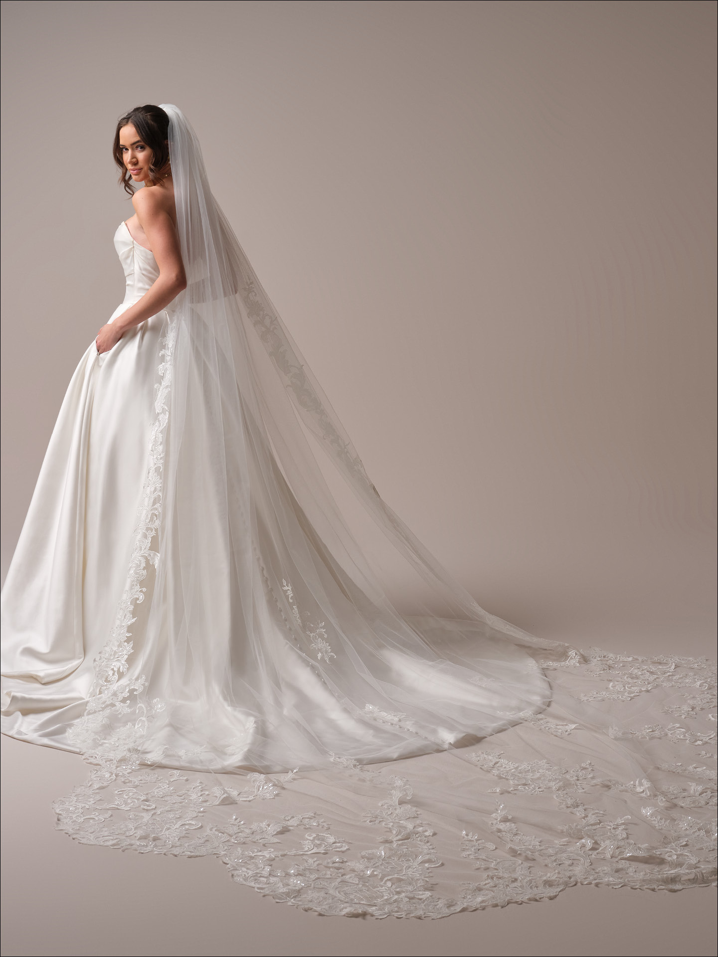 Simple, classic satin ruched wedding gown by Maggie Sottero. Exquisite tailoring and draping creates a gorgeous couture statement. Check out our Maureen Lane gown which is a fitted sister style to this gown.