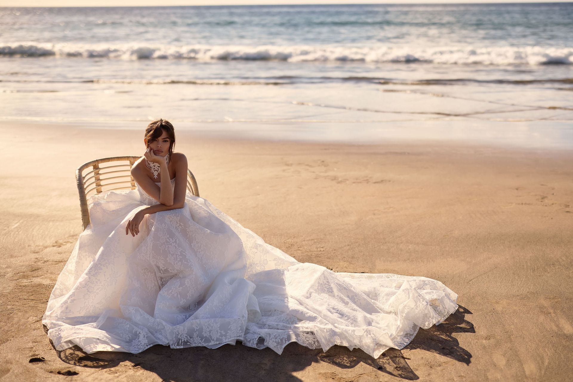 Vintage-inspired exquisite wedding gown cut in a princess silhouette from delicate chantilly lace. Featuring a straight neckline, a structured bodice with built-in cups and visible boning that lengthens the silhouette, a zip closure, and a voluminous lace skirt with a train that flares out from the corset. This ballgown features a baroque-inspired ornament embellished with beadwork. Includes detachable pearl jewellery for versatile styling — wear it on the corset or as a necklace. For a complete and romantic look, the gown can be styled with an exquisite lace Monica choker and ruched lace Monica cuffs.