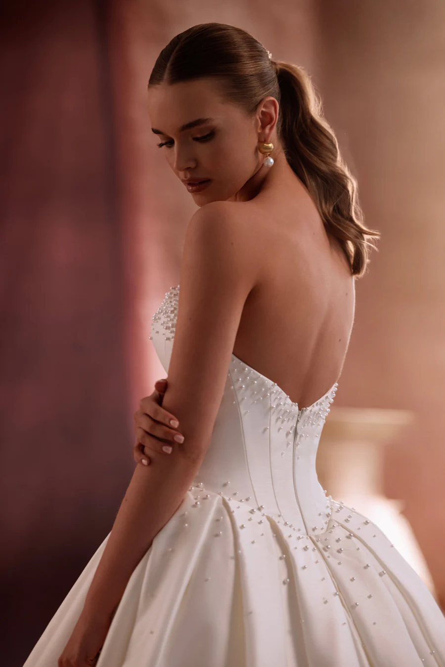 The Noor gown is designed for brides who want timeless beauty with a touch of sparkle. Its strapless, fitted bodice features a clean corset structure, softly accentuated with delicate pearl embellishments that continue over the skirt. The wide pleats create graceful movement, while the full silhouette makes a confident and unforgettable entrance. This gown balances modern simplicity with refined detail – perfect for a bride who loves minimal design but still wants a gown that feels truly special. Noor proves that small details, like carefully placed pearls, can transform a classic cut into something extraordinary.