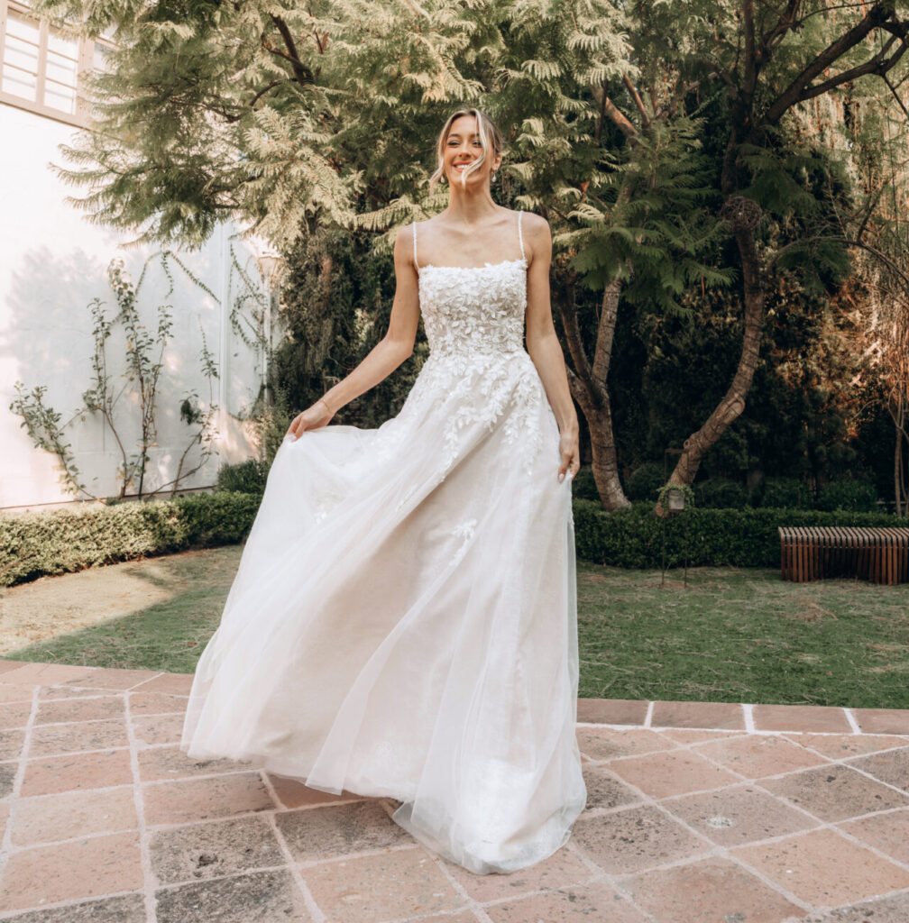 A modern fairytale comes to life with Style SY8105, designed for the romantic at heart. This ethereal lace and tulle wedding dress features a soft, A-line silhouette adorned with delicate, nature-inspired lace for a dreamy, whimsical effect. Beaded spaghetti straps frame a flattering square neckline, leading to a sheer bodice embellished with intricate 3D lace. From the waist, layers of airy tulle cascade into a flowing A-line skirt, creating an effortless sense of movement and weightless elegance. For the bride seeking a touch of magic, this enchanting gown ensures an unforgettable bridal moment.