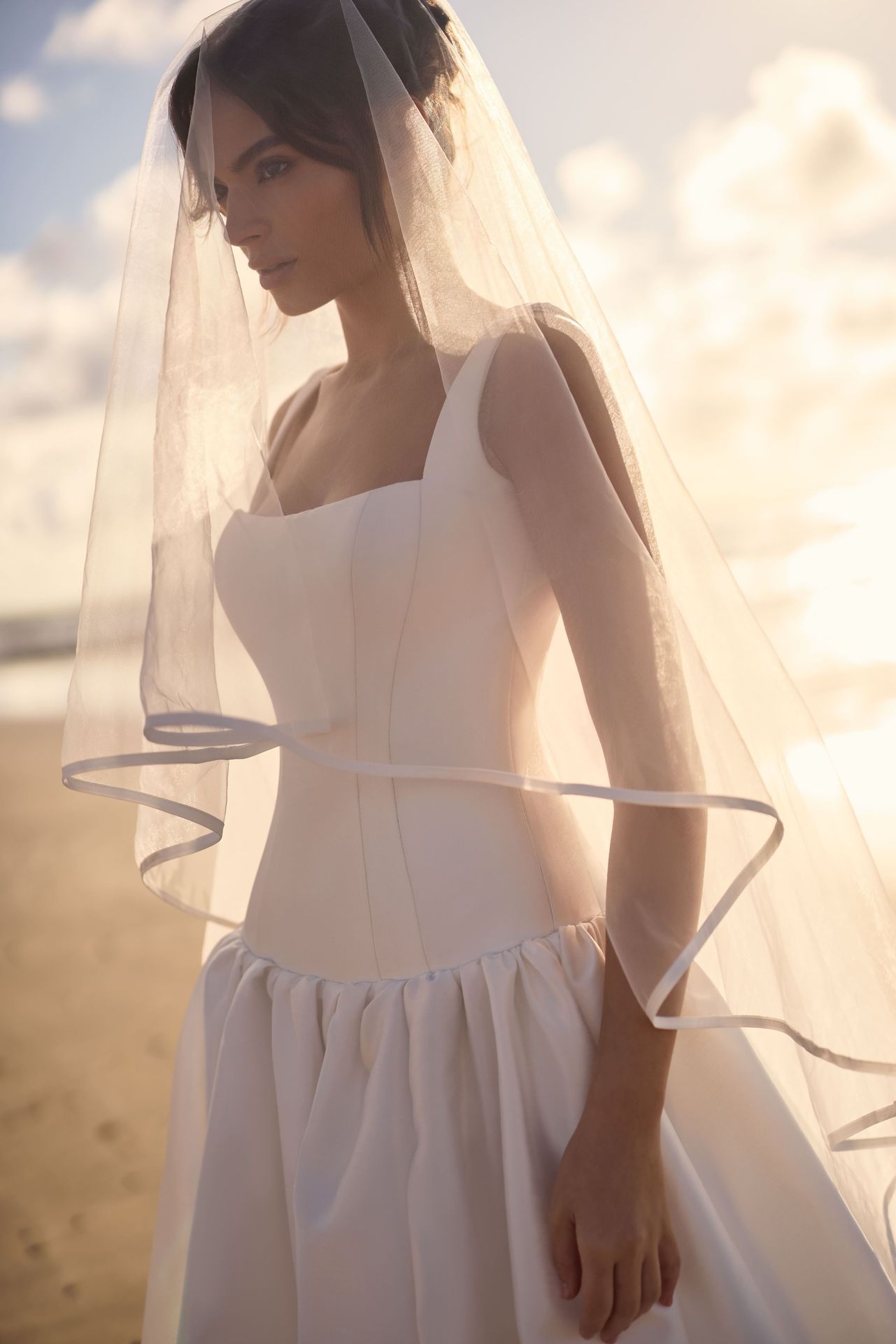 Minimalist drop-waist A-line wedding gown crafted from satin in a corset style. Featuring a square neckline framed by wide shoulder straps and